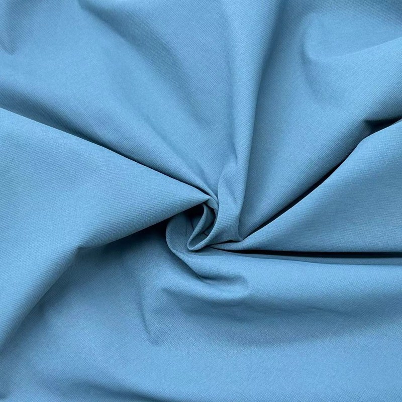Fabrique en Taffeta élastique à perles en forme de soie, Spécification: 70D+40D*160D+160D, Composition: 95% nylon recyclé, 5% spandex, Poids: 182 g/m2, Largeur: 56-57 pouces,Sensation rigide et structurée avec une fonctionnalité étanche.